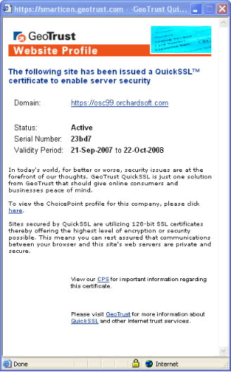 <p> </p> <center> <table width="75%" border="0" cellpadding="0"> <tr valign="top"> <td align="center"> <img src="/orchard.gif" alt="Orchard Software Corporation"> <br> <div class=FooterText>© 2008 Orchard Software Corporation</div> </td> <td valign="center"> <!-- GeoTrust QuickSSL [tm] Smart Icon tag. Do not edit. --> <SCRIPT LANGUAGE="JavaScript" TYPE="text/javascript" SRC="//smarticon.geotrust.com/si.js"></SCRIPT> <!-- end GeoTrust Smart Icon tag --> </tr> </table> </center>